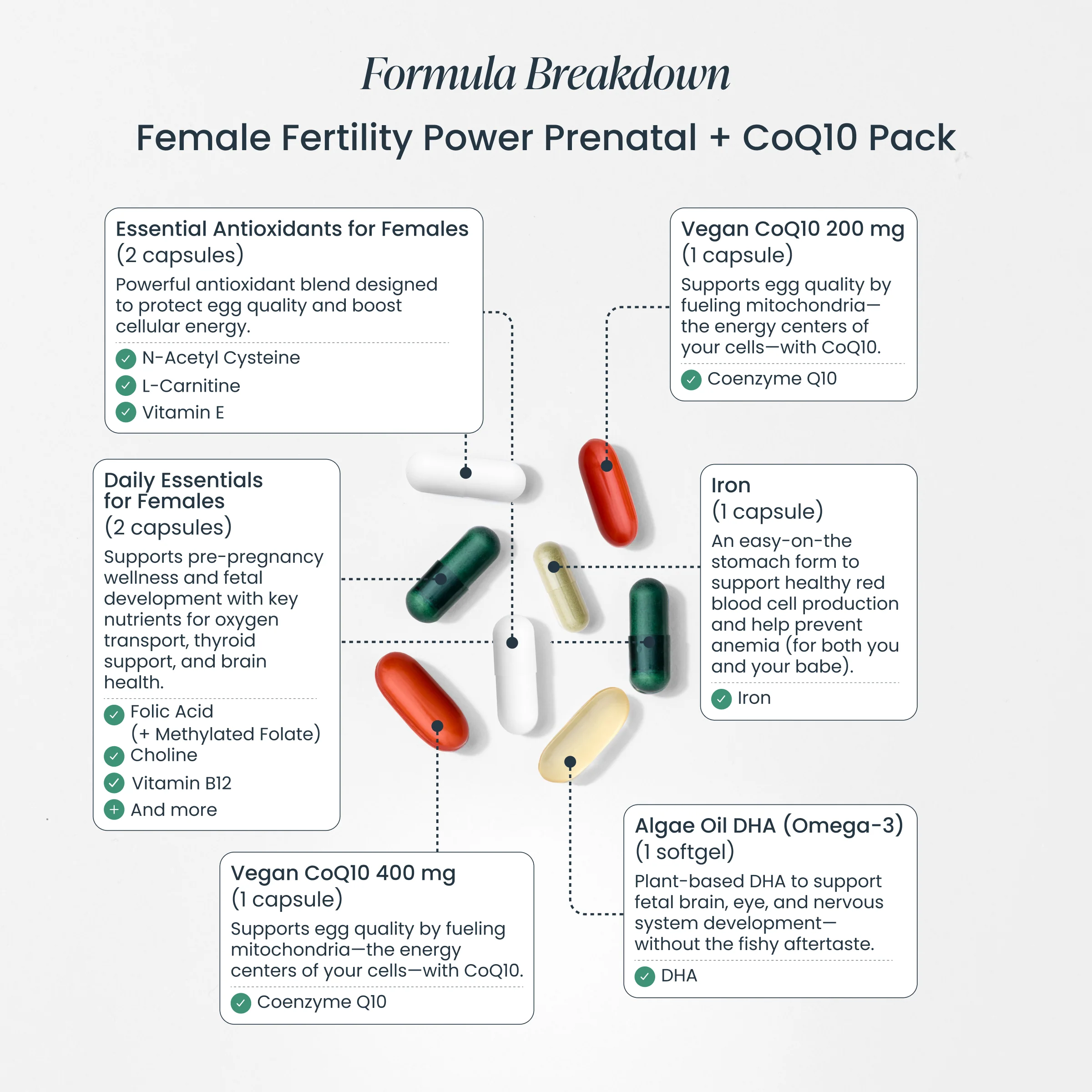 - Female Fertility Power Prenatal + CoQ10 Pack: Research-backed nutrients to support and protect egg health, and meet early-pregnancy requirements, at the doses recommended by fertility doctors and OB/GYNs